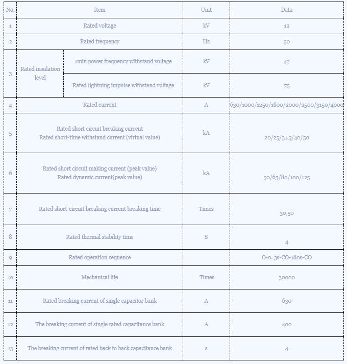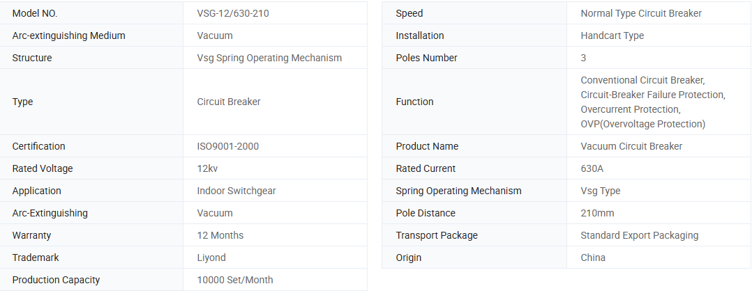 VSG тип вътрешно напрежение вакуумна верига прекъсвач в съответствие с националния стандарт GB1984 „AC с високо напрежение на веригата“, JB/T3855 „3.6 ~ 40.5kV вътрешен променлив променлив разрушител за променлив разрушител“ и IEC60056 „прекъсвач на променлив ток“. Получете „10-35kV закрито високо напрежение вакуумна верига, подреждащ технически условия“. Той има предимствата на малкия размер, лекото тегло, подходящи за честа работа и прекъсване без поддръжка и се използва по-популярно в 3KV-40,5KV дистрибуторската мрежа.
