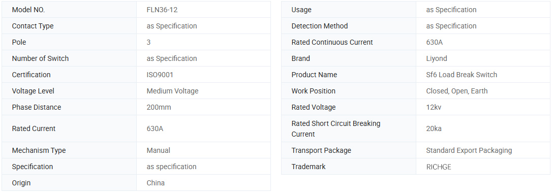 FLN36-12KV SF6 Load Break Switch е превключващо оборудване за средно напрежение, използвайки SF6 газ като дъга гасене и изолационна среда. Има три работни позиции: отворени, затворени, положение на земята в превключвателя. Компактният размер, лесната инсталация и фината адаптивност към околната среда правят превключвателя подходящ за много различни приложения.