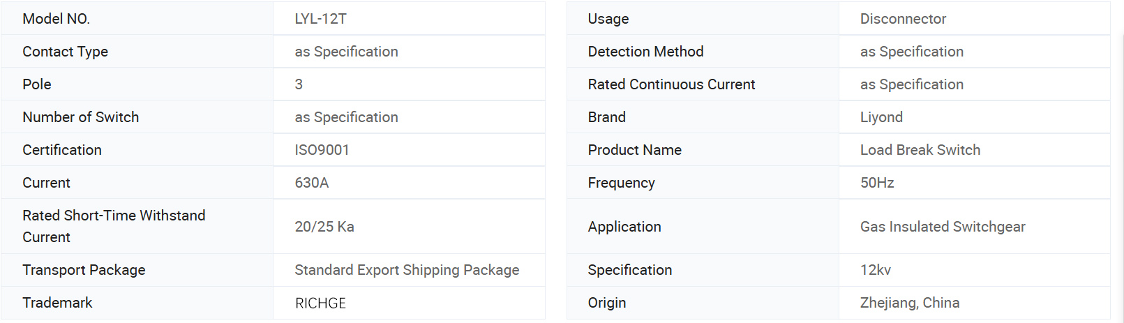 Превключвател за натоварване LYL-12T отговаря на съответните изисквания на GB3804-2004 „3,6kV~40,5kV превключвател за променлив ток за високо напрежение“ и GB16926-1997 „Комбиниран уред за превключвател за променлив ток за високо напрежение и предпазител“. Главна верига: 630A-20kA (4s), 25kA (3s); Механичен живот: 5000 пъти; Заземителна верига: 20kA (2s); Механичен живот: 2000 пъти.