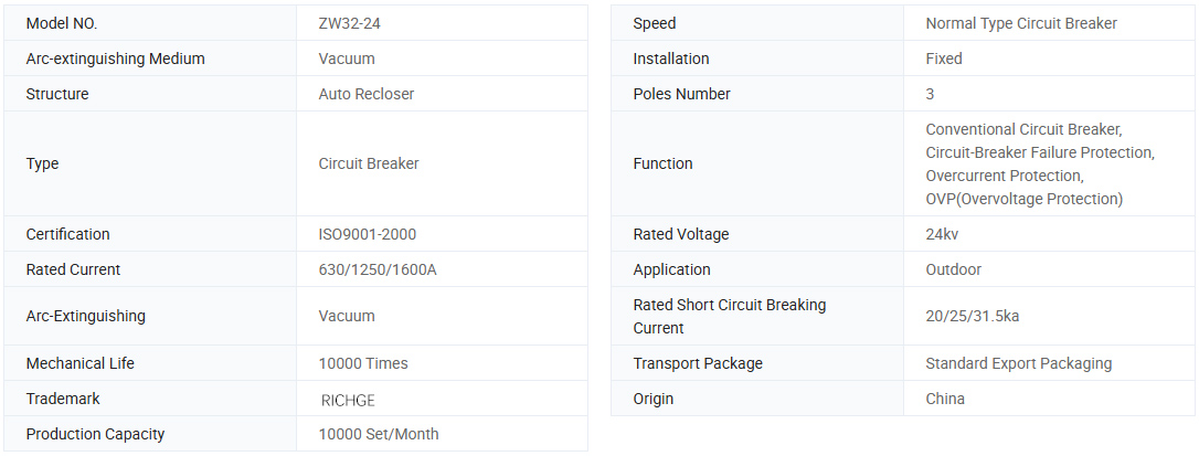 Серия ZW32-24 серия външно напрежение вакуум-прекъсвач се използва в AC 50Hz, номинално напрежение 24kV трифазна захранваща система за затваряне/счупване на ток, прекомерно натоварване и ток на късо съединение. Прекъсвачът може да оборудва с рекордиране на контролера на токовите характеристики на прекъсването на идентичността и да постигне множество автоматични повторения или изолация на повреда. Само предвиденият PT като източник на енергия, той се превръща в интелигентен прекъсвач, способен да контролира с сигнален изход на напрежение и ток. Електронният PT осигурява захранване и може да завърши триетапната композитна защита на закъснение за забавяне на тока и късо съединение и бързо разбиване.
