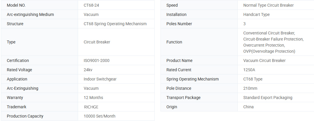 CT68-24 прекъсвач на вакуумната верига е вакуумният прекъсвач с високо напрежение на закрито, използван главно в разпределени електроенергийни системи, мини, петрол, химическа промишленост, металургия, строителство, транспорт, въглищни мини и общини, както и в системите за електроснабдяване и разпределение на жилищни сгради на Urban, както и други места. Той се използва широко за защита на мощностното оборудване с високо напрежение от свръх ток, късо съединение, недостатъчно напрежение и прекомерно напрежение и може надеждно да гарантира безопасната работа на електропровода.