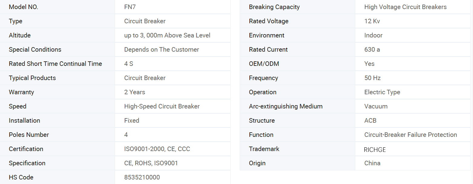 FN7-12 AC превключвател за високо напрежение е нов тип превключвател за високо напрежение на закрито, произвеждащ газ. Подходящ е за трифазни AC захранващи системи с AC 50Hz и номинално напрежение 12kV. Използва се за прекъсване на тока на натоварване и затваряне на ток на късо съединение.