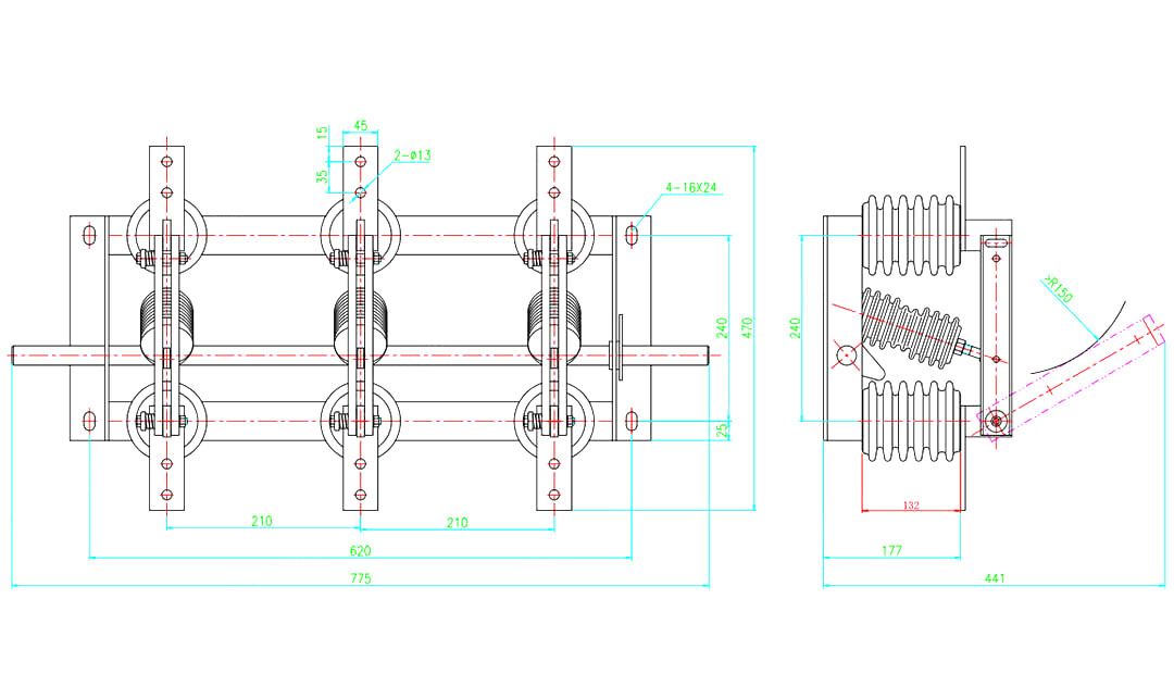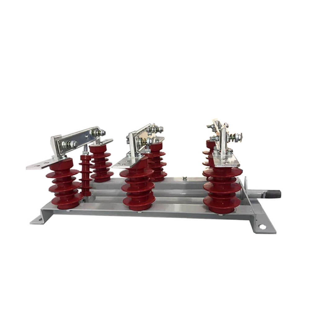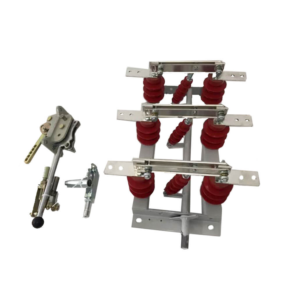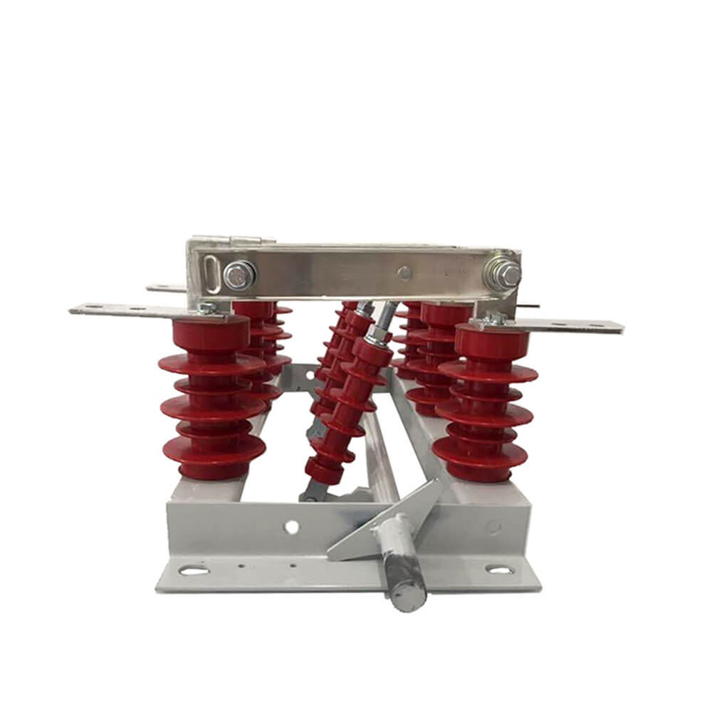 Проводимата част на GN19-12/400, 630, 1000, 1250 тип изключване е фиксиран върху основата с два стълба изолатори за всяка фаза. (GN19-12C/400, 630, 1000, 1250 тип има един стълб изолатор и един изолатор за корпус на порцела.) Трите фази са инсталирани паралелно, а проводимата част се състои от статични контакти на контактни ножове и държачи за контакт (или проводими пръти). Всяка фаза на контактния нож е свързана в средата на изолатора на вратовръзката, връзката на изолатора и инсталирана в основата на свързаното вретено. Вретеното е свързано към свързващия прът (предоставен от потребителя) и CS6-1 тип движещ се механизъм през дръжката. Свързващият контактен нож е съставен от две наклонени медни плочи, които не само увеличават областта на разсейване на топлината на контактния нож, за да се намали долната температура, но и подобрява механичната якост на контактния нож, така че динамичната стабилност на превключвателя да се подобри. Единият край на контактния нож е монтиран на контактния блок (или на проводимия прът) от болт (кола на Шоу). GN19-12/1000, 1250 в контакт с инсталирането на магнитна заключваща плоча, плюс целта на магнитната заключваща плоча е, че когато голям ток на късо съединение за подобряване на двата контактния нож на канала между | привличане. GN19-12/400, 630 Превключвателите за изключване имат малка граница през ток, така че няма нужда да добавяте магнитна заключваща плоча.