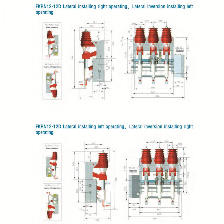 Серия FKN12-12D Series Air-Blast IOAD прекъсване на прекъсване и FKRN12-12D серия Air-Blast Load Break Switch Fuse Combration Apparat са нови серийни комутационни уреди се прилагат за трифазна електрическа разпределителна система с номинални 12 kV, действащи като защитни и контролни апарати за трансформатори, кабели и надземни кабели. Тези серии са особено приложими в селските, градските терминални подстанции и сглобяемите подстанции, както и в захранването на Ring Network. FKN12-12D може да се счупи и да направи IOAD ток и прекалено ток. FKRN12-12D може да прекъсне и направи ток на натоварване с прекомерно натоварване и ток на късо съединение (IIMITED ток предпазител). Този продукт е представен с естетически външен вид на структурата на удара. Надеждно блокиране и високо ниво на изолация. В механизма за работа на пролетта за съхранение, скоростта на включване/изключване е без влиянието на работната сила. За Arc-Extinguish, електрически дъга-Extinguish във вътрешността на изолационния капак, свободният газ се случва при искрите, не причиняват потомство на изолиращо ниво между фази и фаза на земята. Изолационната капак на капака разделя електрифицираната част, като по този начин засилва степента на защита на основния блок на пръстена. Контактът с меден капиер и основният контакт носи надеждна проводимост и дълъг живот. Този продукт постига звукова слава поради лесна поддръжка и работа, както и надеждна производителност. Той е в съответствие с IEC62271-105.