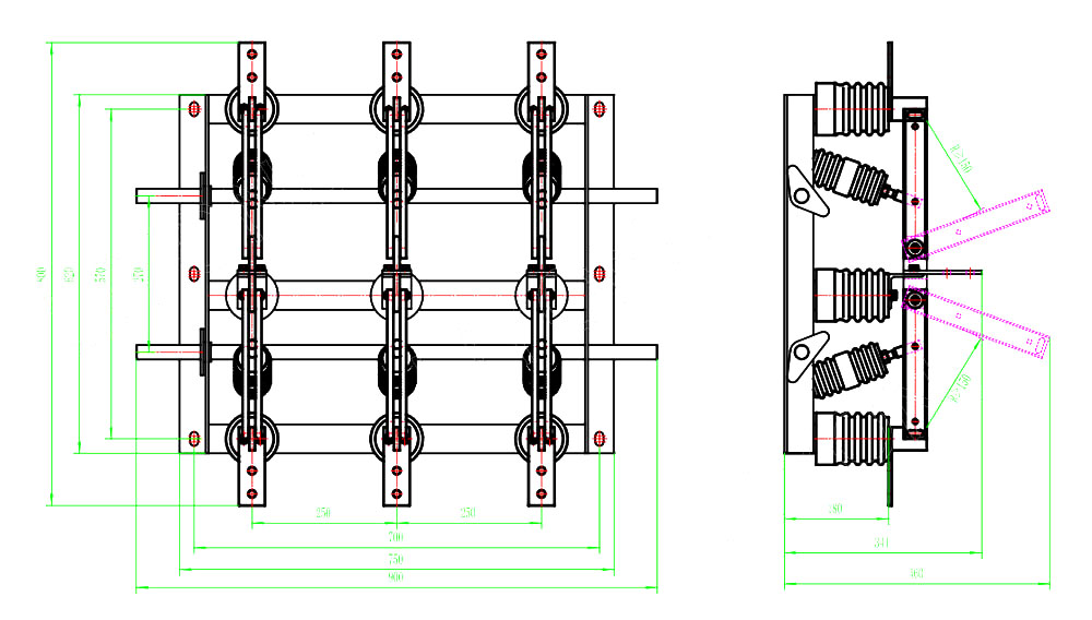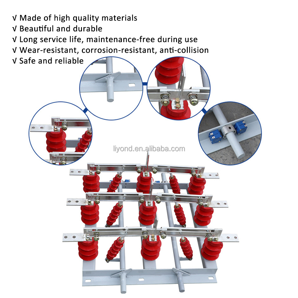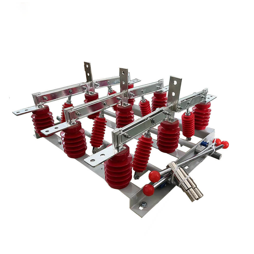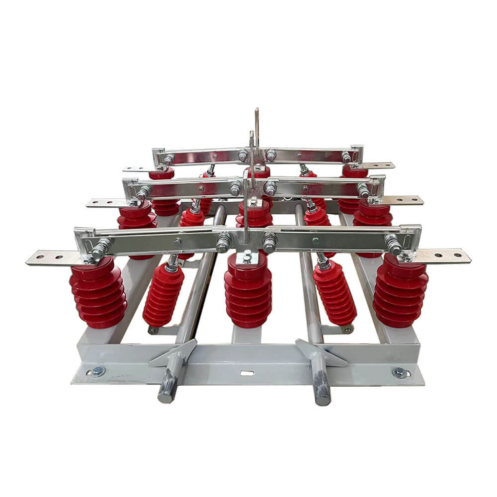Проводимата част на GN19-12/400, 630, 1000, 1250 тип изключване е фиксиран върху основата с два стълба изолатори за всяка фаза. (GN19-12C/400, 630, 1000, 1250 тип има един стълб изолатор и един изолатор за корпус на порцела.) Трите фази са инсталирани паралелно, а проводимата част се състои от статични контакти на контактни ножове и държачи за контакт (или проводими пръти). Всяка фаза на контактния нож е свързана в средата на изолатора на вратовръзката, връзката на изолатора и инсталирана в основата на свързаното вретено. Вретеното е свързано към свързващия прът (предоставен от потребителя) и CS6-1 тип движещ се механизъм през дръжката. Свързващият контактен нож е съставен от две наклонени медни плочи, които не само увеличават областта на разсейване на топлината на контактния нож, за да се намали долната температура, но и подобрява механичната якост на контактния нож, така че динамичната стабилност на превключвателя да се подобри. Единият край на контактния нож е монтиран на контактния блок (или на проводимия прът) от болт (кола на Шоу). GN19-12/1000, 1250 в контакт с инсталирането на магнитна заключваща плоча, плюс целта на магнитната заключваща плоча е, че когато голям ток на късо съединение за подобряване на двата контактния нож на канала между | привличане. GN19-12/400, 630 Превключвателите за изключване имат малка граница през ток, така че няма нужда да добавяте магнитна заключваща плоча.