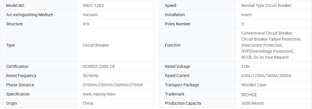 VBI-12 Средно напрежение вакуумно-прекъсвач е вид на закрито оборудване за превключване на средно напрежение с 50Hz/60Hz трифазно променливо 12 kV номинално напрежение, което комбинира технологията на ABB Corporation в Швейцария и разработена в Китай. Продуктът отговаря на стандартния GB1984 & IEC62271-100.