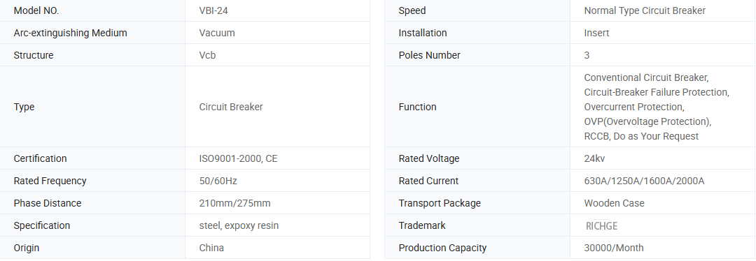 Серия VBI-24 от вакуумна верига на вътрешно напрежение с вградени стълбове е три фрази A.C.50 Hz вътрешно разпределение на захранването с номиналното напрежение от 24 kV.it, използвано за защита и контрол на електрическото оборудване в областта на индустрията и минните предприятия, електроцентралите и подстанцията.