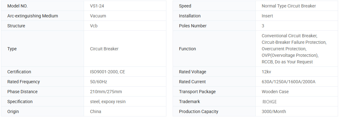 VS1-24 серия от вакуумна верига на вътрешно напрежение с обикновен изолиран цилиндър е трифраза A.C. 50 Hz на закрито оборудване за разпределение на мощността с номиналното напрежение от 24kV. Използва се за защита на контролирането на електрическото оборудване в областта на индустрията и минното предприятие, електроцентралите и подстанцията. Този тип вакуумни вериги отговаря на националните стандарти и уговорката на стандарта IEC, способността достига степен на M2-E2-C2.